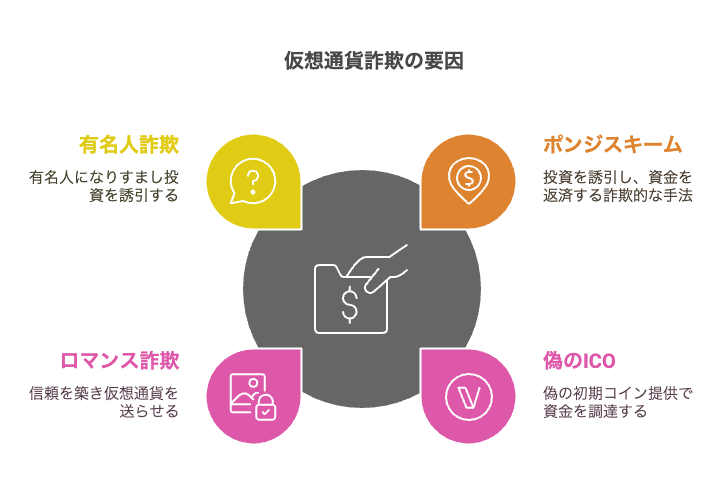 手口はさまざまで、「このコインに投資すれば必ず儲かる」と甘い言葉で誘い、投資後に連絡が取れなくなるポンジスキームや、「新しい仮想通貨プロジェクトを始めたい」としてお金をだまし取る偽のICO詐欺などがあります。
