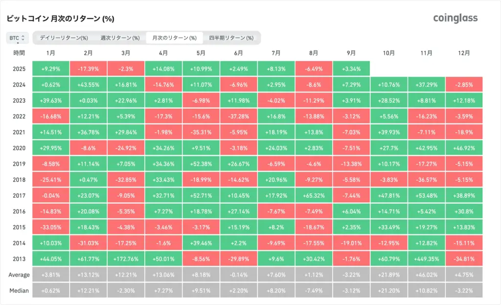 統計的にビットコインは10月の平均リターンがプラスであり、他の月に比べてパフォーマンスが安定していることが知られています。