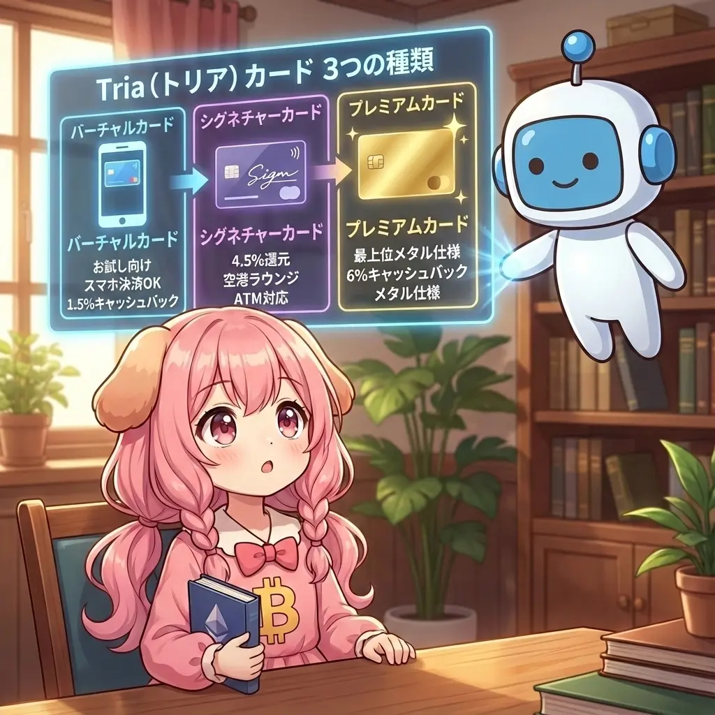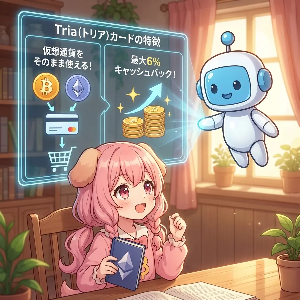 いい質問だね、ビトちゃん!Triaは仮想通貨をそのまま使える最新のカードなんだ。しかも最大6%もキャッシュバックがつくよ。