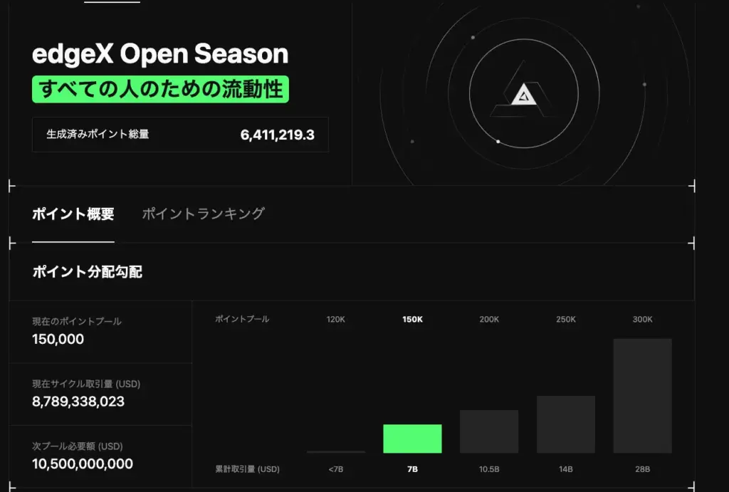 これは、ユーザーがedgeXの分散型取引所(DEX)を実際に使いながら報酬を得られる仕組みで、正式トークン配布(TGE)前の「エアドロップ前段階」として位置づけられています。