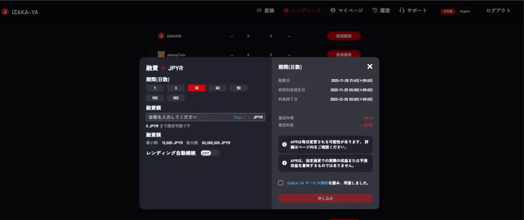 IZAKA-YAのJPYRレンディングでは、キャンペーン期間でなくても “推定年利100%前後” が表示されることがあります。