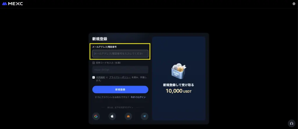 MEXCの口座開設は、海外取引所の中でも非常にシンプルです。公式サイトから、メールアドレスまたは電話番号を登録し、パスワードを設定するだけでアカウントを作成できます。登録自体は数分で完了し、最低限の操作で取引画面にアクセス可能です。