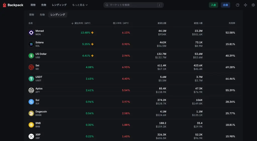 Backpack Exchangeで現在利用できる主な機能は、レンディング(貸暗号資産)です。