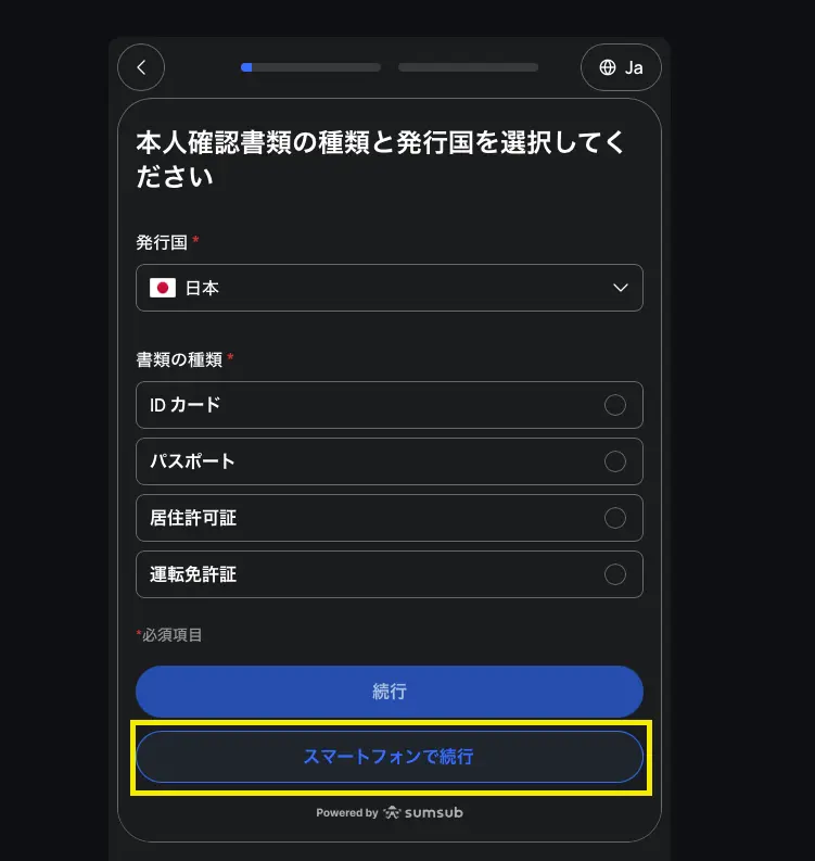 書類を選択したら、「スマートフォンで続行」をクリックし、