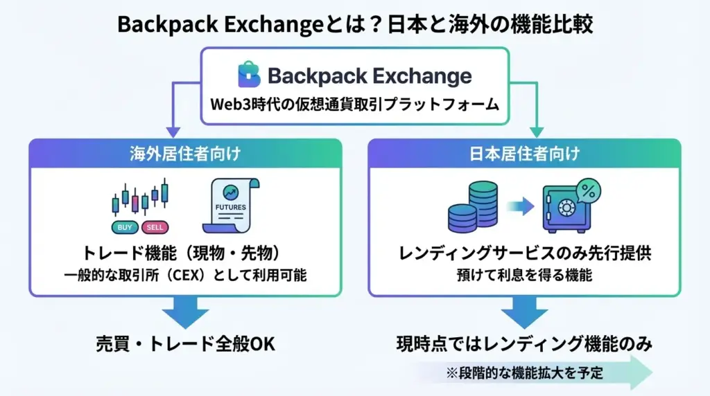 つまり、Backpack Exchange自体はトレード機能を備えた取引所ですが、日本では段階的な提供の一環としてレンディングからスタートしている、という位置づけです。