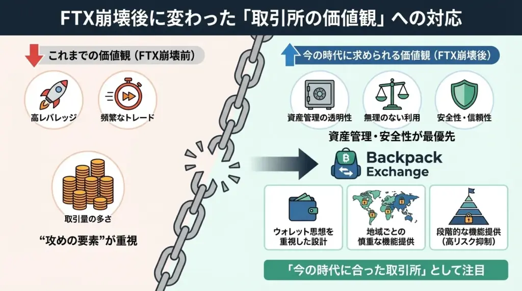 それ以降、仮想通貨業界では安全性や透明性をより重視する流れが加速しています。Backpack Exchangeは、こうした業界全体の反省を背景に生まれた取引所です。