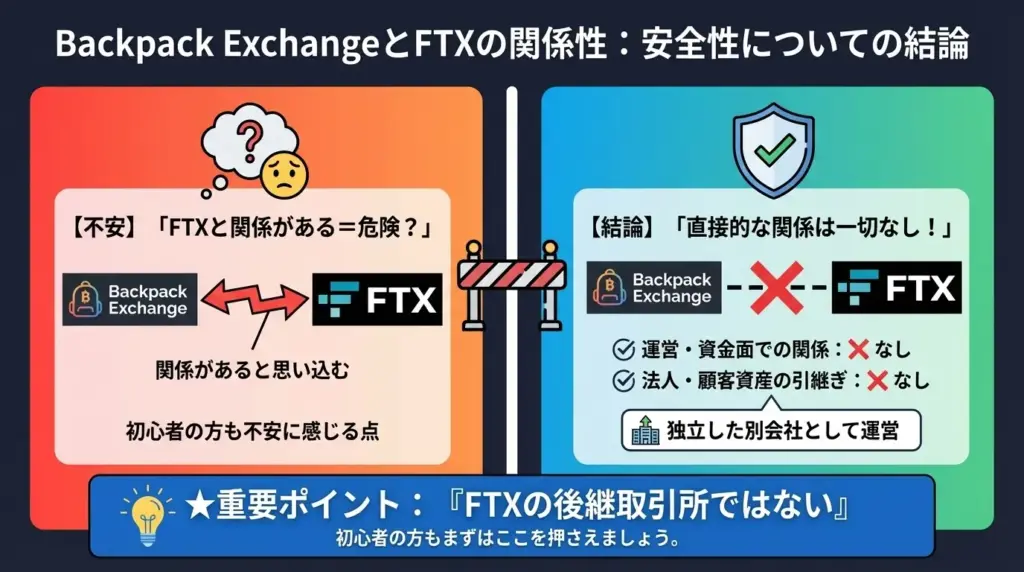 Backpack Exchangeについて調べると、「FTXと関係がある=危険なのでは?」と不安に感じる方も多いでしょう。結論から言うと、Backpack ExchangeとFTXの間に、運営や資金面での直接的な関係はありません。