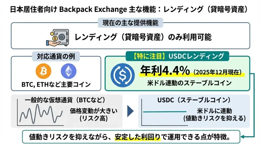 現在、日本居住者が利用できる主な機能はUSDCのレンディングで、年利4.4%(2025年12月現在)という比較的安定した利回りが提供されています。