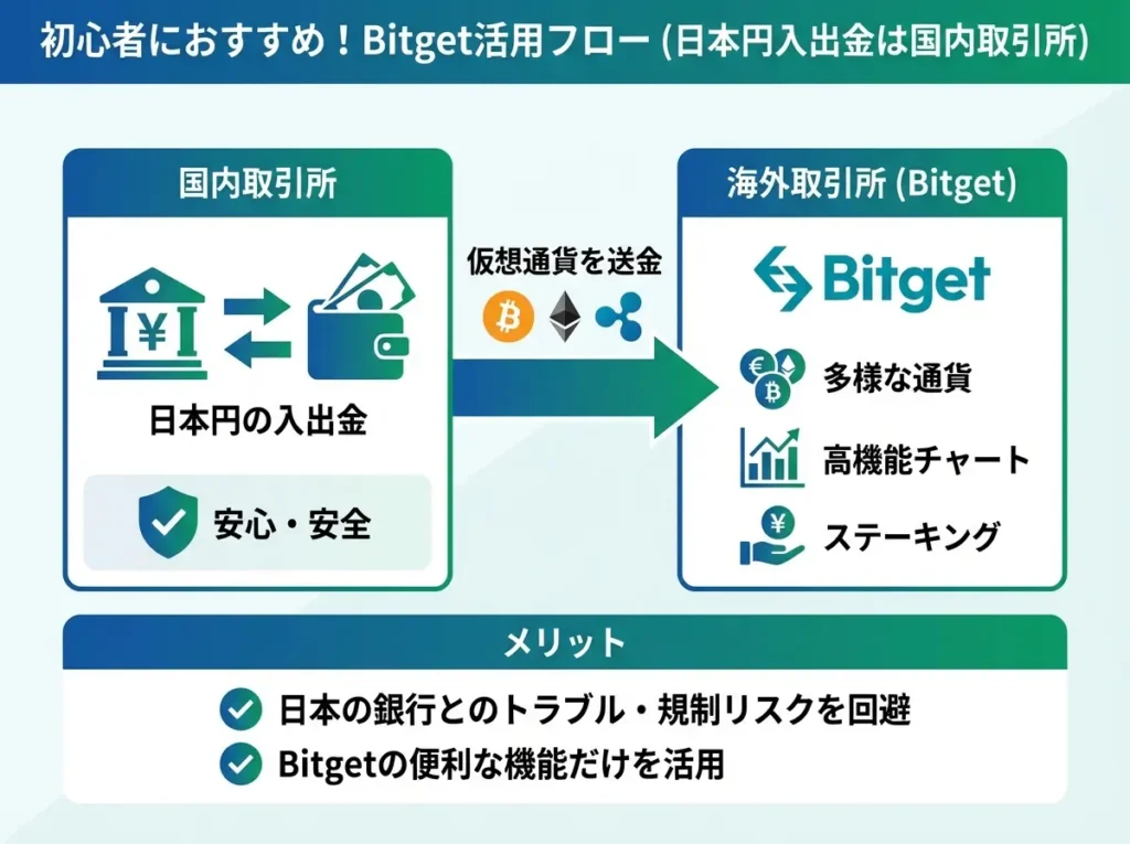 こうすることで、日本の銀行との直接的なトラブルや規制リスクを避けつつ、Bitgetの便利な機能だけを活用できます。