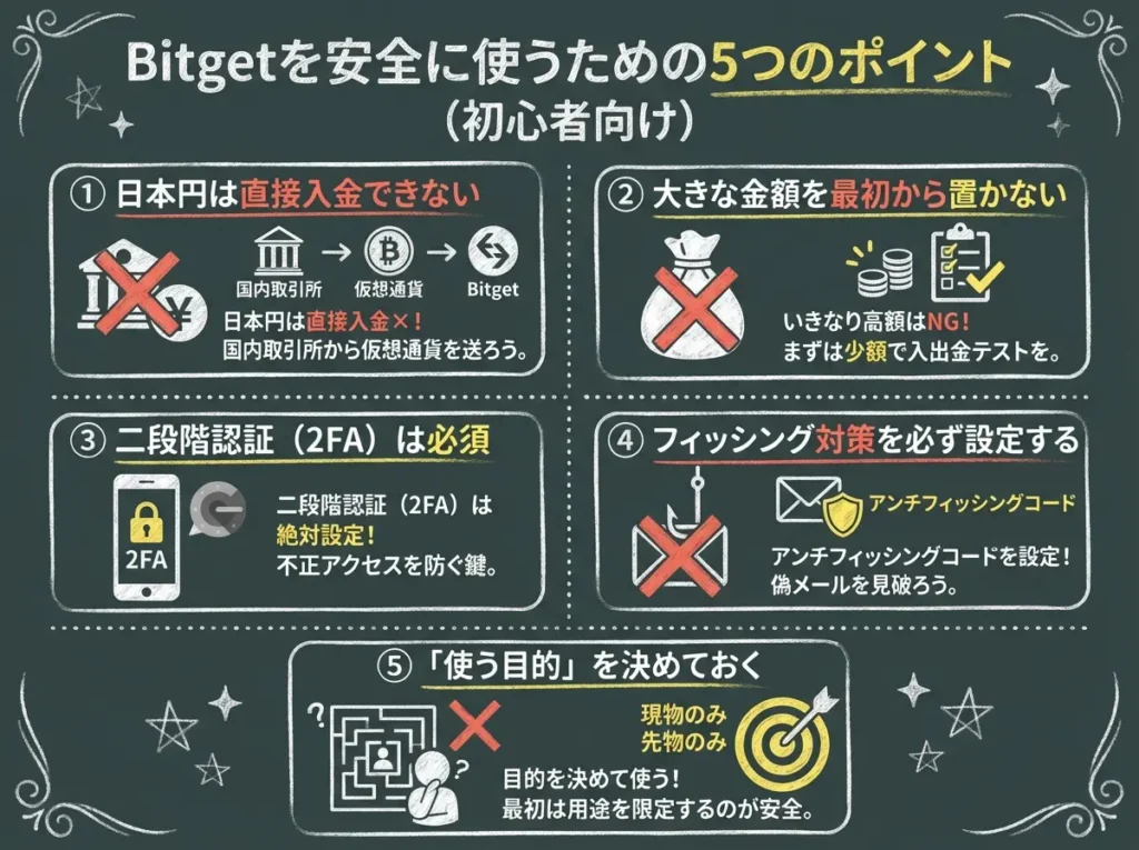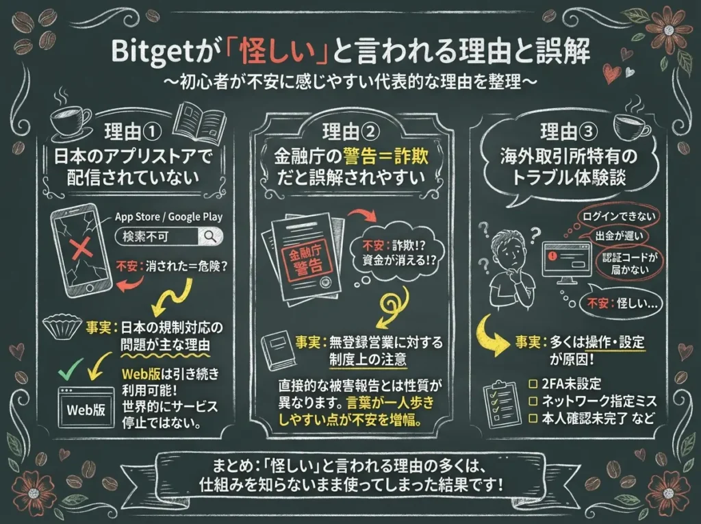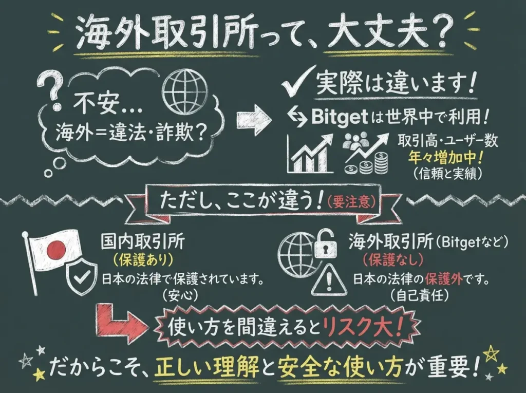 Bitgetは、日本の金融庁に登録されていない海外の仮想通貨取引所です。そのため「怪しい」「危険では?」と不安に感じる方が多いのは自然なことです。