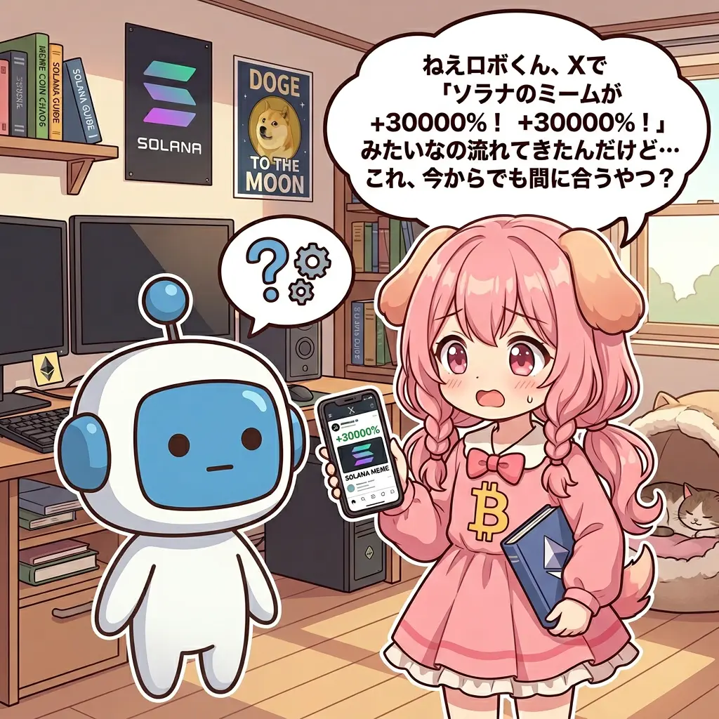 ビトちゃんねえロボくん、Xで「ソラナのミームが+30000%!」みたいなの流れてきたんだけど…これ、今からでも間に合うやつ?