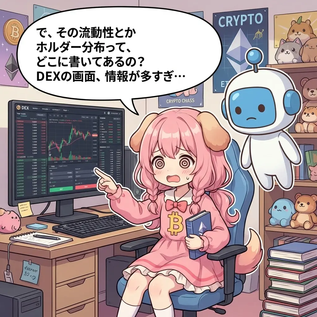 で、その流動性とかホルダー分布って、どこに書いてあるの?DEXの画面、情報が多すぎ…