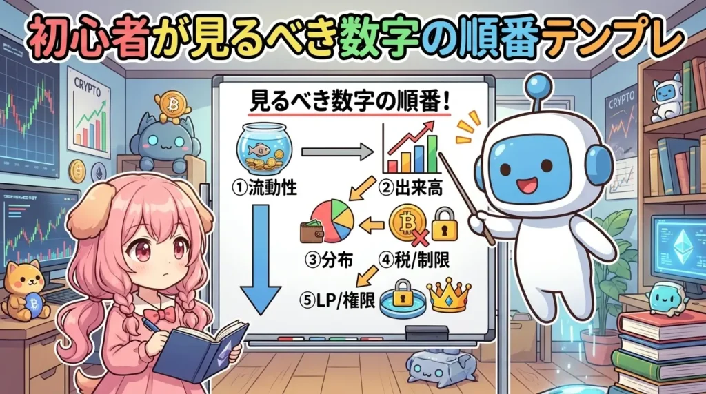 順番を固定しよう。おすすめは「流動性→出来高→分布→税/制限→LP/権限」だよ。