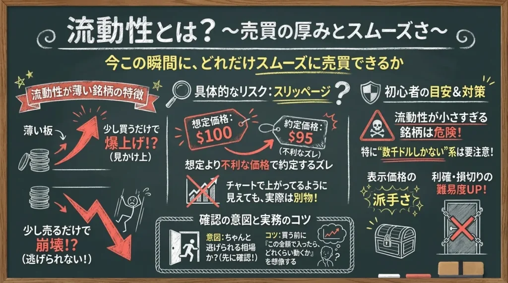 もう一歩だけ具体化すると、流動性が薄いとスリッページ(想定より不利な価格で約定するズレ)が大きくなります。つまり、チャート上では「上がってる」ように見えても、実際に自分が買う価格・売れる価格は別物になりがちです。