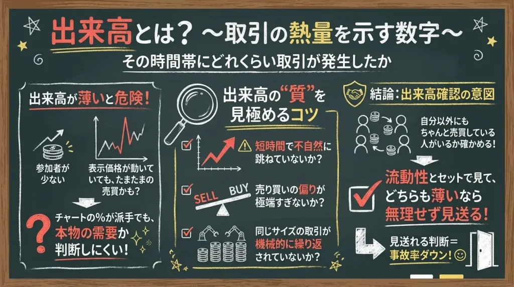 要するに出来高は、「自分以外にもちゃんと売買している人がいるか」を確かめる指標です。流動性とセットで見て、どちらも薄いなら無理に追わず、見送れる判断ができるようになります。