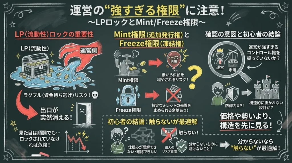さらに注意したいのが、Mint権限(追加発行権)やFreeze権限(凍結権)です。Mintが残っていれば、後からトークン供給を増やされる可能性がありますし、Freeze権限があれば特定ウォレットの売買を止められる余地もあります。つまり、価格以前に「ルールを一方的に変えられる状態」かどうかが問題になります。