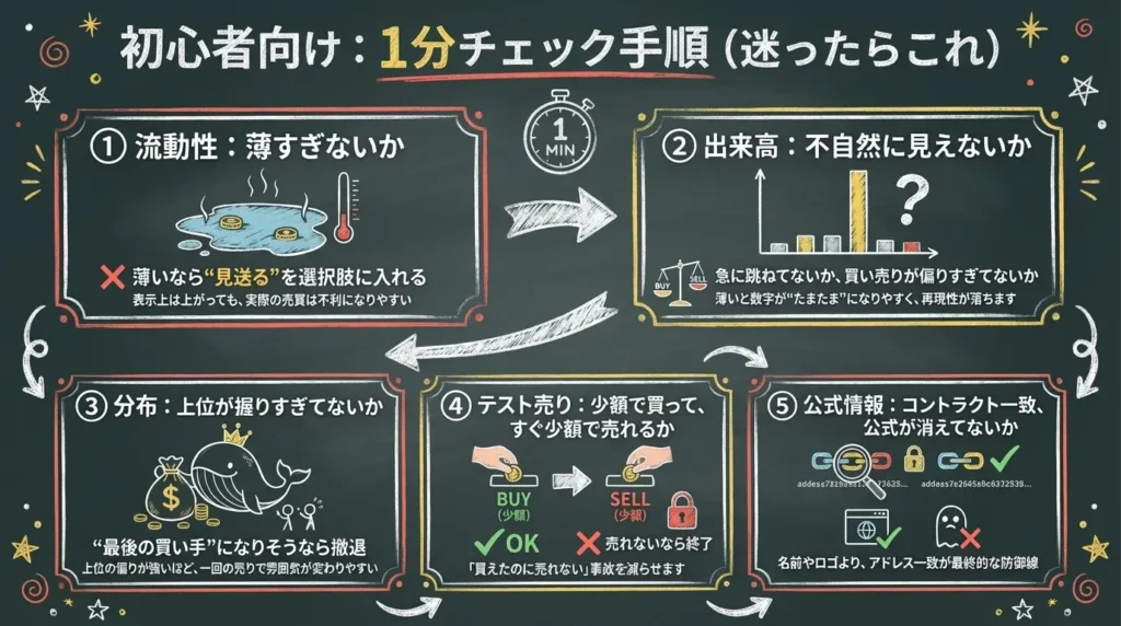 - 初心者がまず見るべき数字の順番(流動性→出来高→分布…)