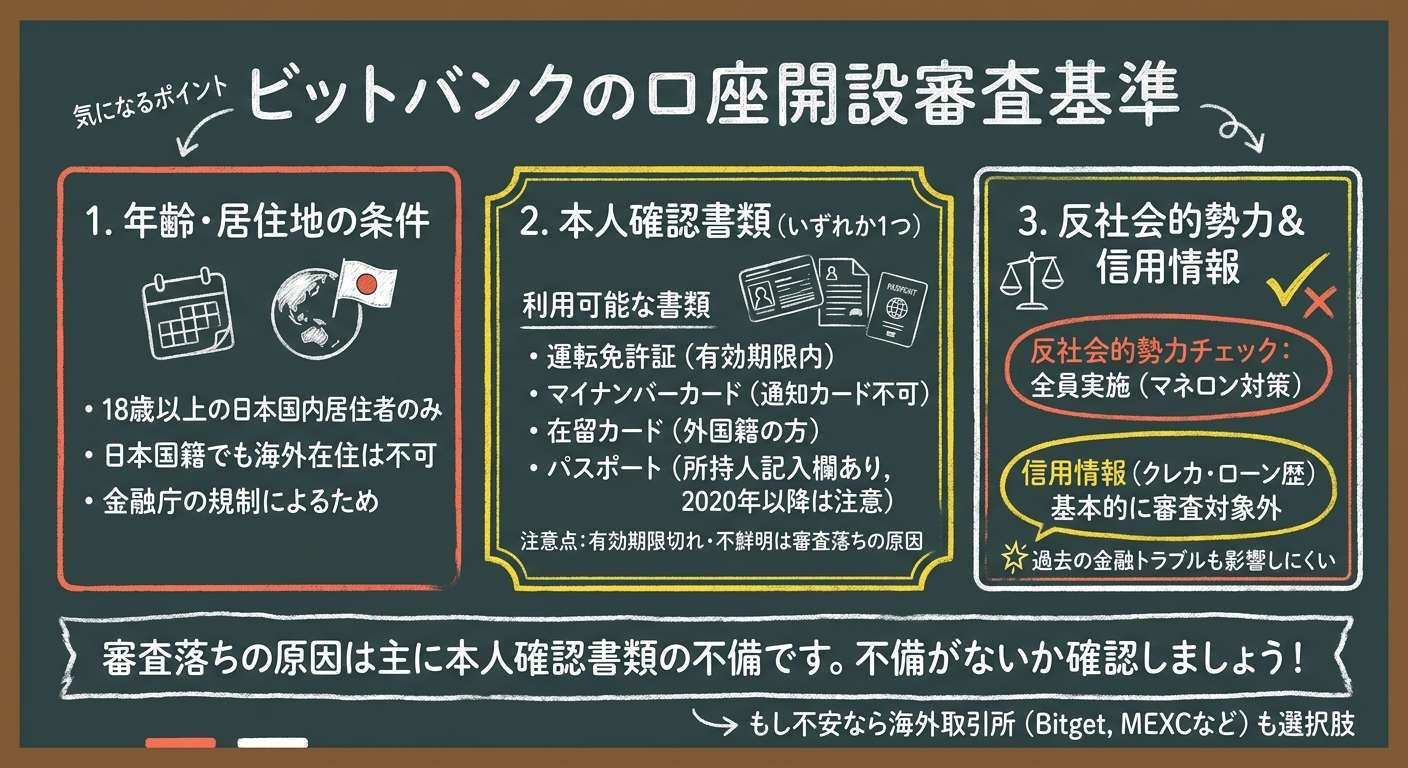 bitbankでは18歳以上かつ日本国内に居住していることが口座開設の必須条件です。特に海外在住の日本人が見落としがちなポイントで、一時帰国中でも住民票がない場合は審査に通りません。