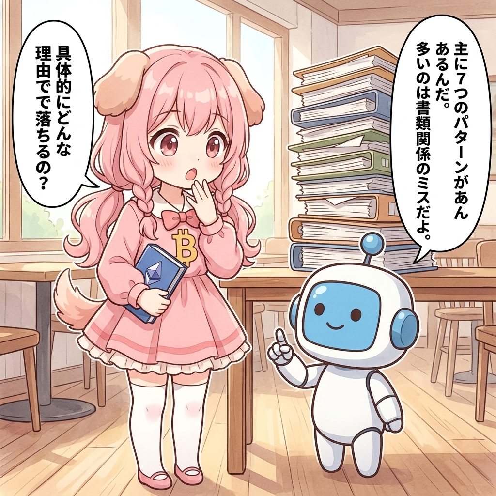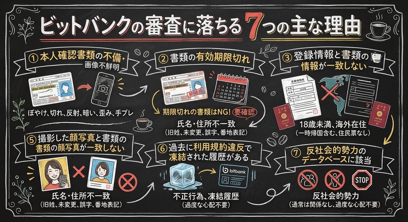 bitbankの審査に落ちる原因は、主に書類の不備や登録情報の不一致など、申込者側のミスによるものがほとんどです。ここでは審査落ちの代表的な7つの理由を詳しく解説します。