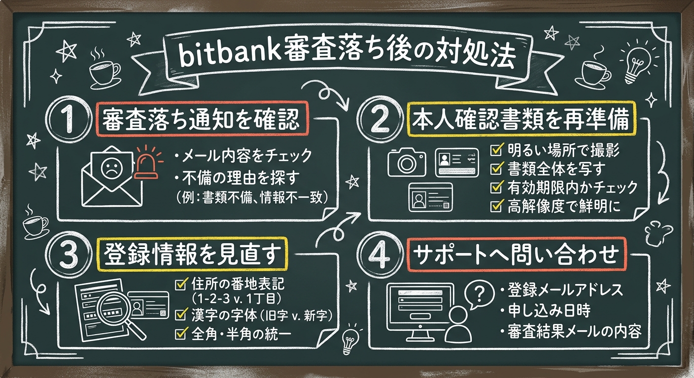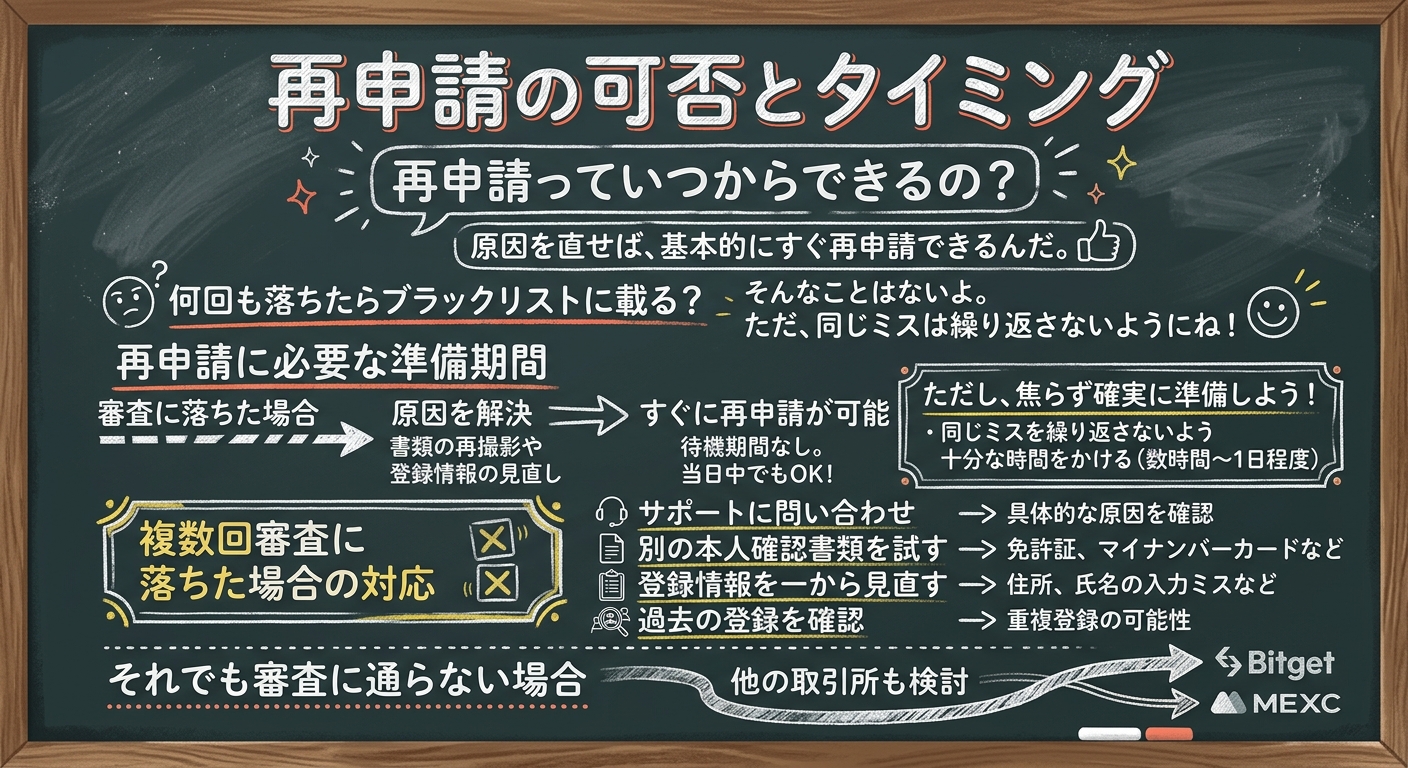 bitbankの審査に落ちた場合でも、原因を解決すればすぐに再申請が可能です。特に待機期間は設けられていないため、書類の再撮影や登録情報の見直しを行えば、当日中にでも再度申し込むことができます。
