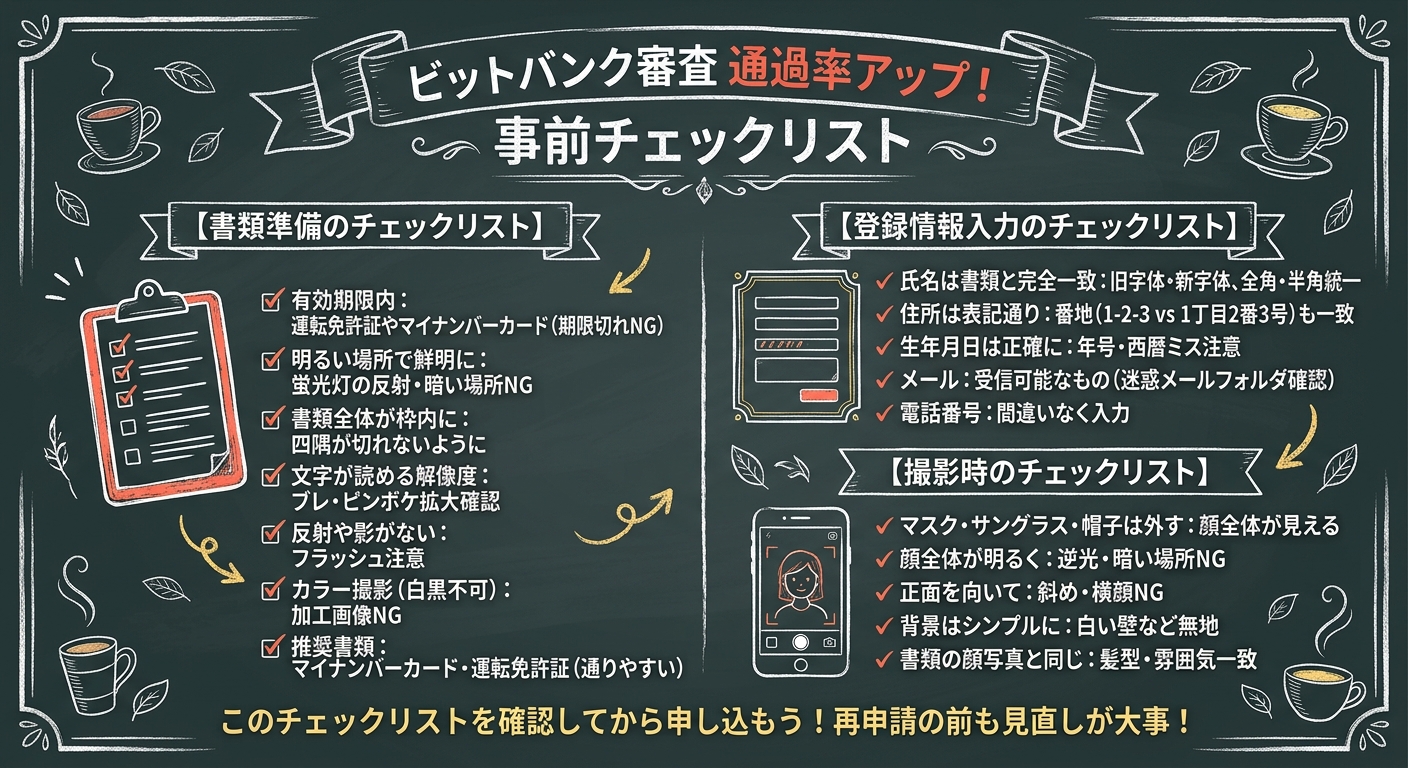 ビットバンクの審査に落ちてしまった方や、これから口座開設を検討している方は、このチェックリストを活用することで審査通過率を大幅に高めることができます。審査に通らない理由の大半は、書類の不備や入力ミスといった防げる要因です。再申請前や初回申し込み前に、以下の項目を確認しておくことで、スムーズに審査を通過できる可能性が高まります。