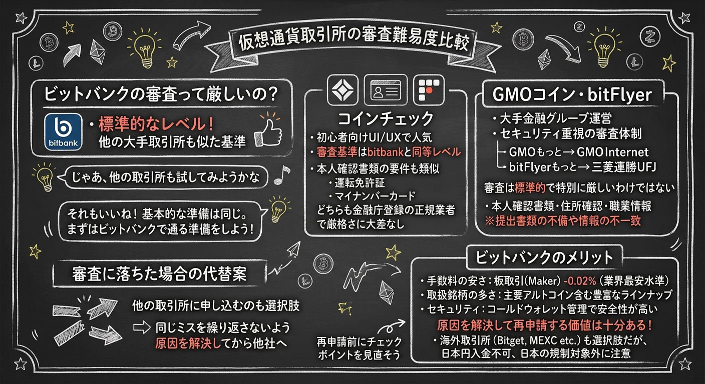 bitbankの審査に落ちた場合、他の取引所に申し込むのも選択肢の一つです。ただし、同じミス(書類不備や住所の不一致など)を繰り返さないよう、まずは落ちた原因を解決してから他社に申し込むことを推奨します。再申請前にチェックポイントを見直しましょう。