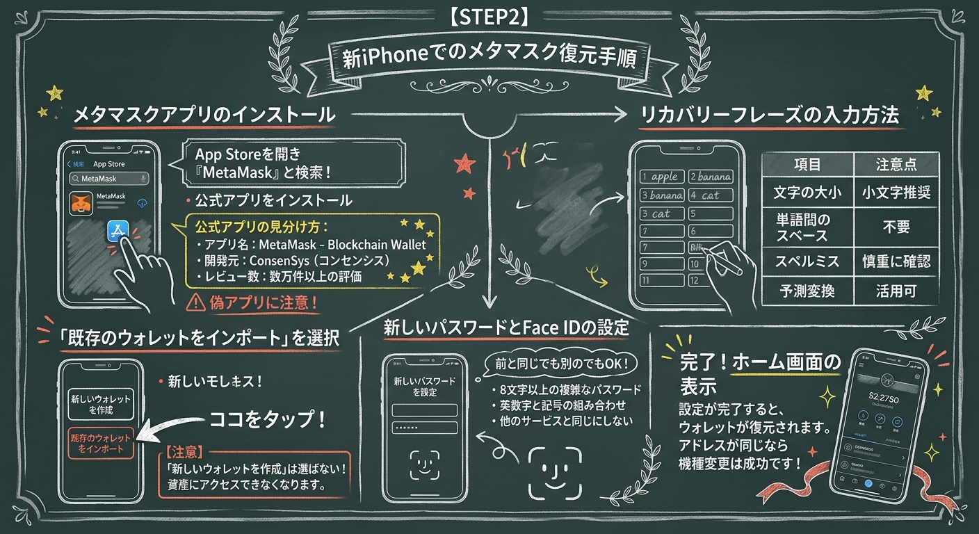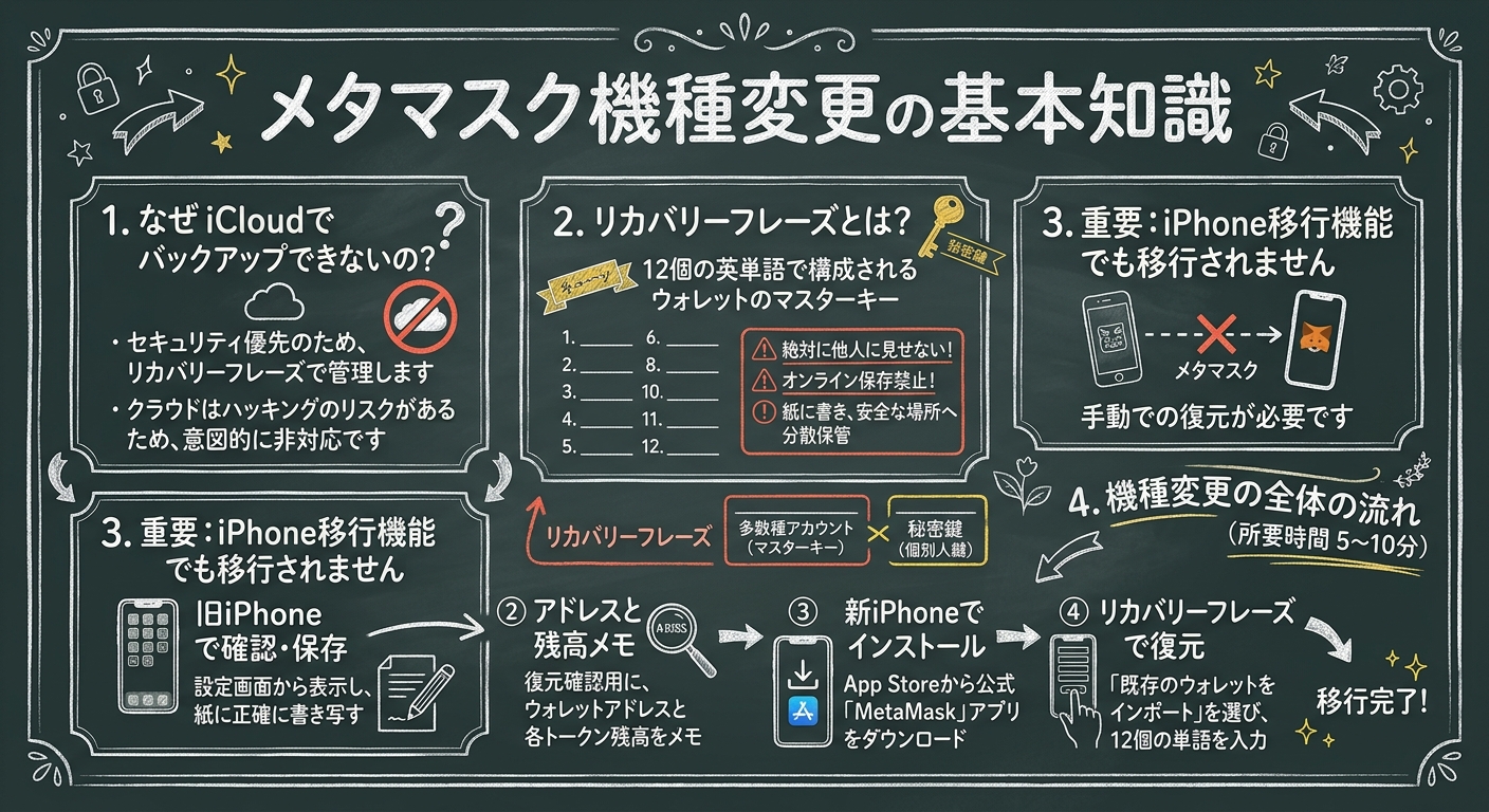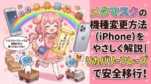 iPhoneの機種変更時、メタマスクはシークレットリカバリーフレーズさえあれば5〜10分で簡単に復元できます。事前準備として、旧端末でフレーズを必ず確認・紙にメモして厳重保管しておくことが最重要です。