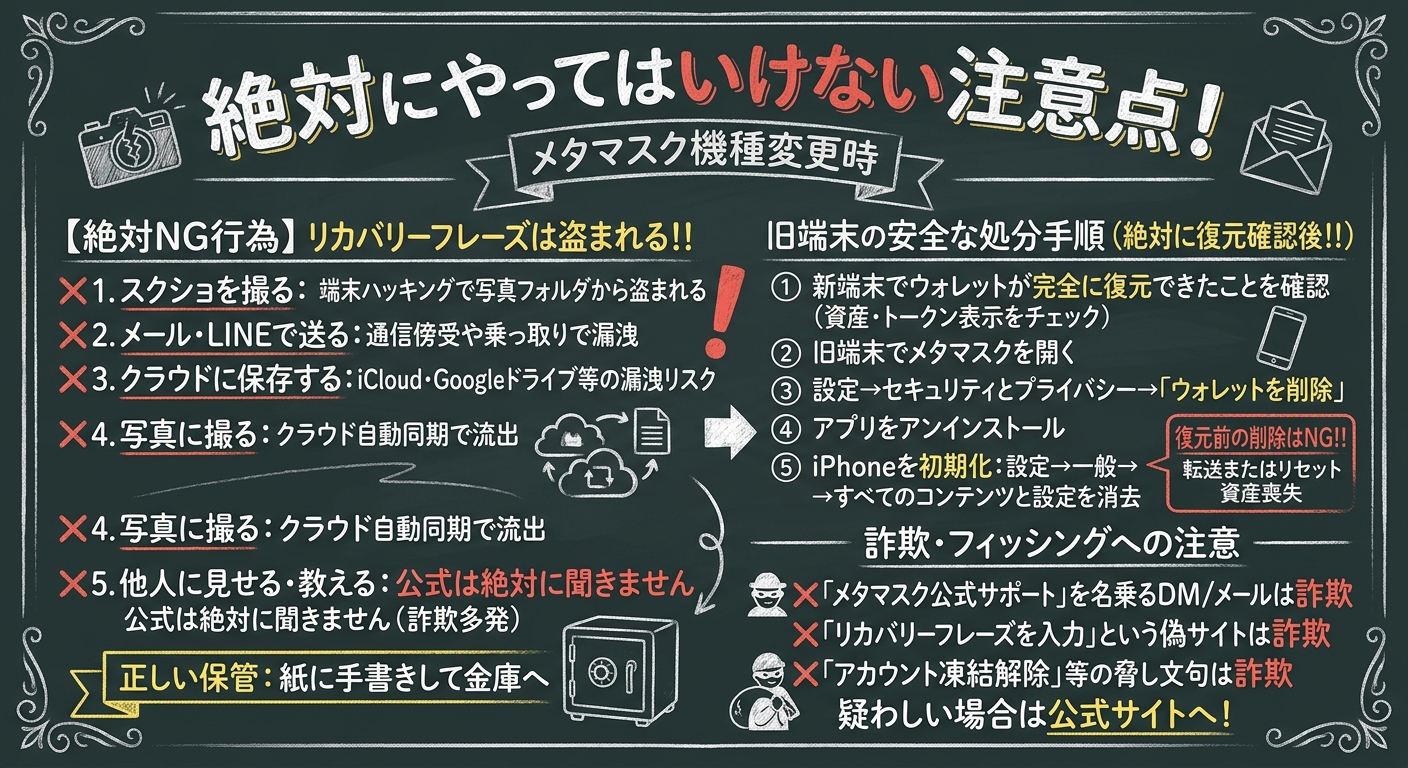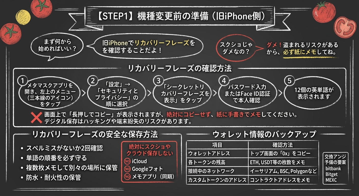 リカバリーフレーズの確認・保存方法、絶対にやってはいけない注意点も含めて、安心して機種変更できるよう完全ガイドします。