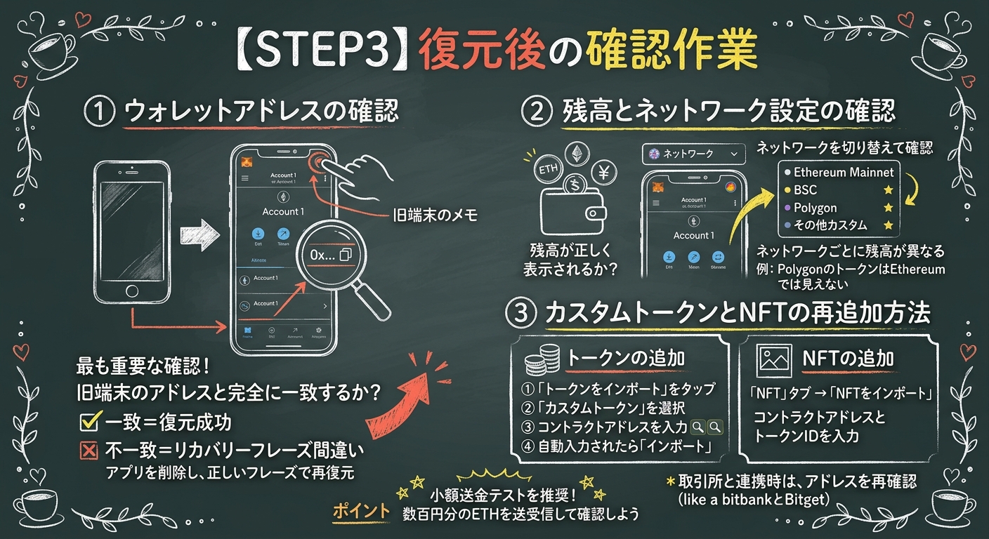 - 新端末でウォレットが完全に復元できたことを確認:資産やトークンがすべて表示されているか念入りにチェック