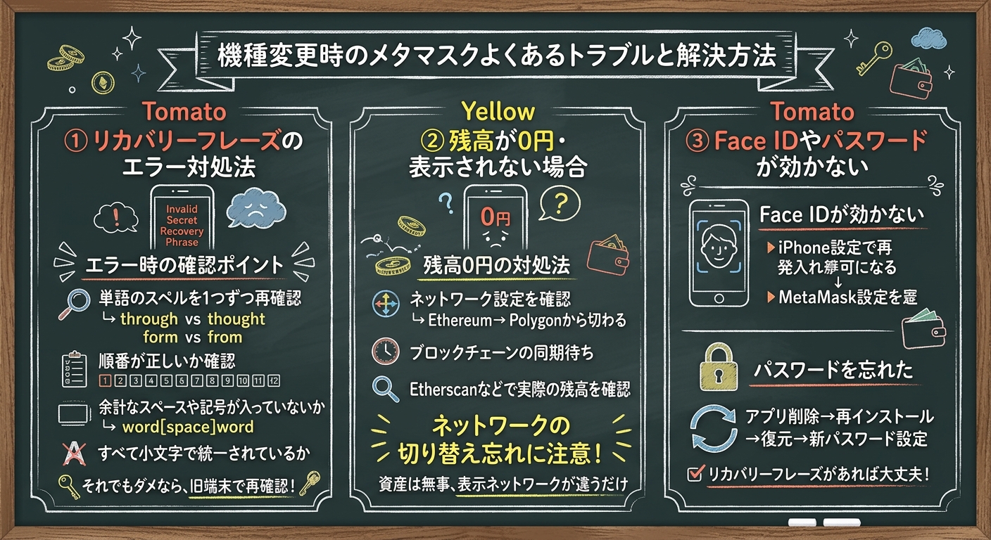 特に多いのがネットワークの切り替え忘れです。例えば旧端末でPolygonネットワークを使っていた場合、新端末で初期設定のイーサリアムメインネットを見ていると残高は0円と表示されます。ネットワークが違うだけで資産は無事なので、落ち着いて確認しましょう。