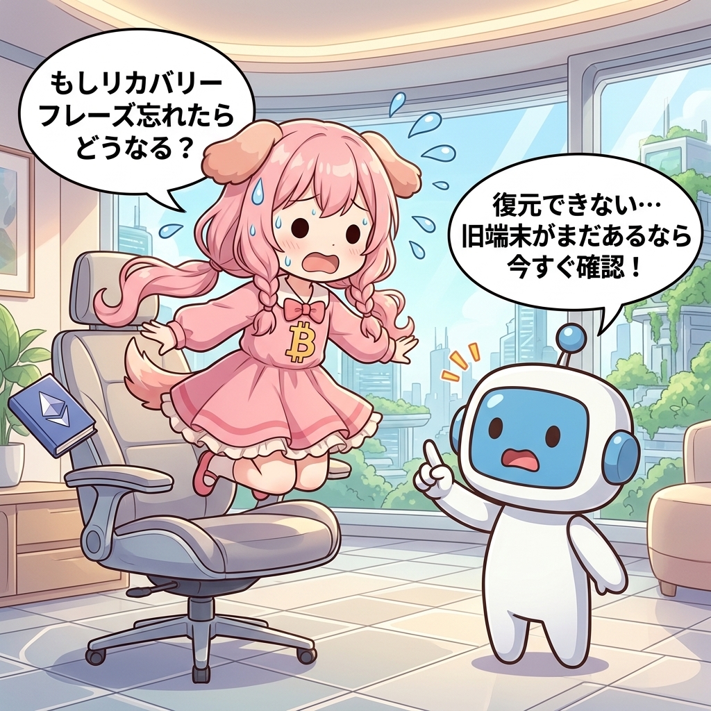 急いで処分すると、万が一復元に失敗した場合に取り返しがつきません。なお、リカバリーフレーズは絶対に他人に教えないこと。