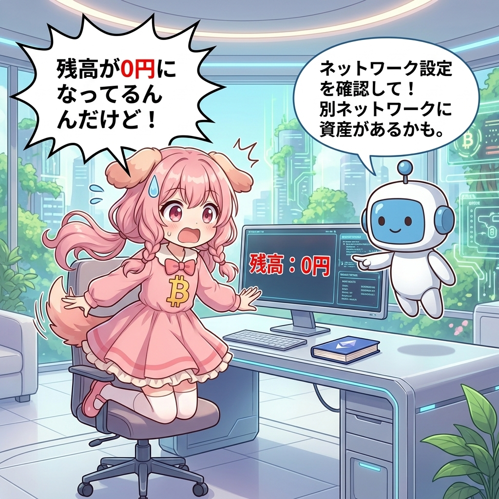 リカバリーフレーズの入力に成功してウォレットは復元できたのに、残高が0円と表示されるケースがあります。資産が消えたわけではないので、焦らず以下を確認してください。